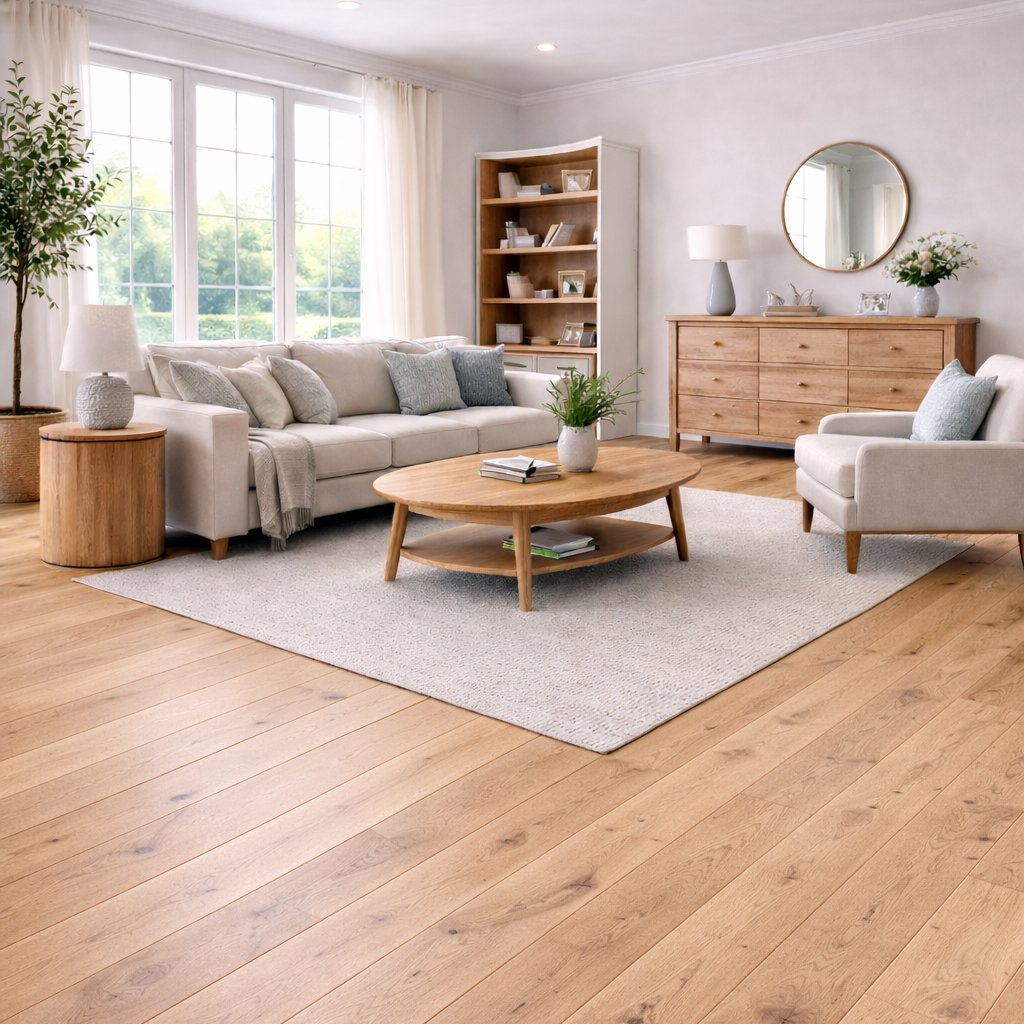 Diese Landhausdiele aus Eiche in markanter Sortierung überzeugt durch eine ausdrucksstarke Optik mit lebendigem Charakter. Prägnante Maserungen, markante Farbunterschiede sowie sichtbare Äste verleihen dem Boden eine natürliche Dynamik und unterstreichen den ursprünglichen Holzcharakter.