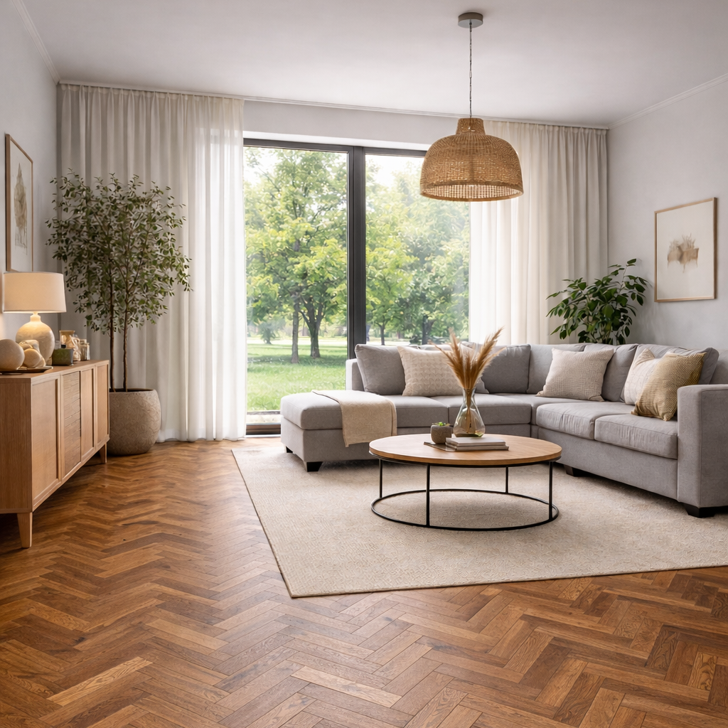 Dieses Stabparkett aus Eiche in Elegant Sortierung überzeugt durch eine ruhige, harmonische Optik und eine natürliche Ausstrahlung. Die dezente Maserung und ausgewogene Farbnuancen schaffen ein zeitloses, hochwertiges Raumgefühl.
